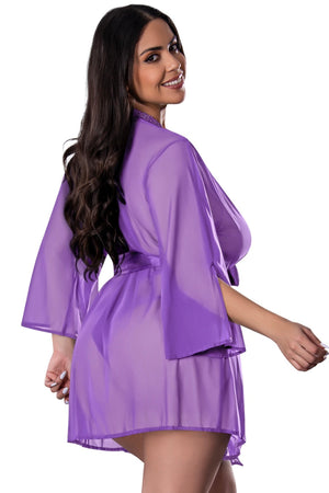 Our style includes: A flowy mesh robe featuring lace trimming and a satin tie belt.