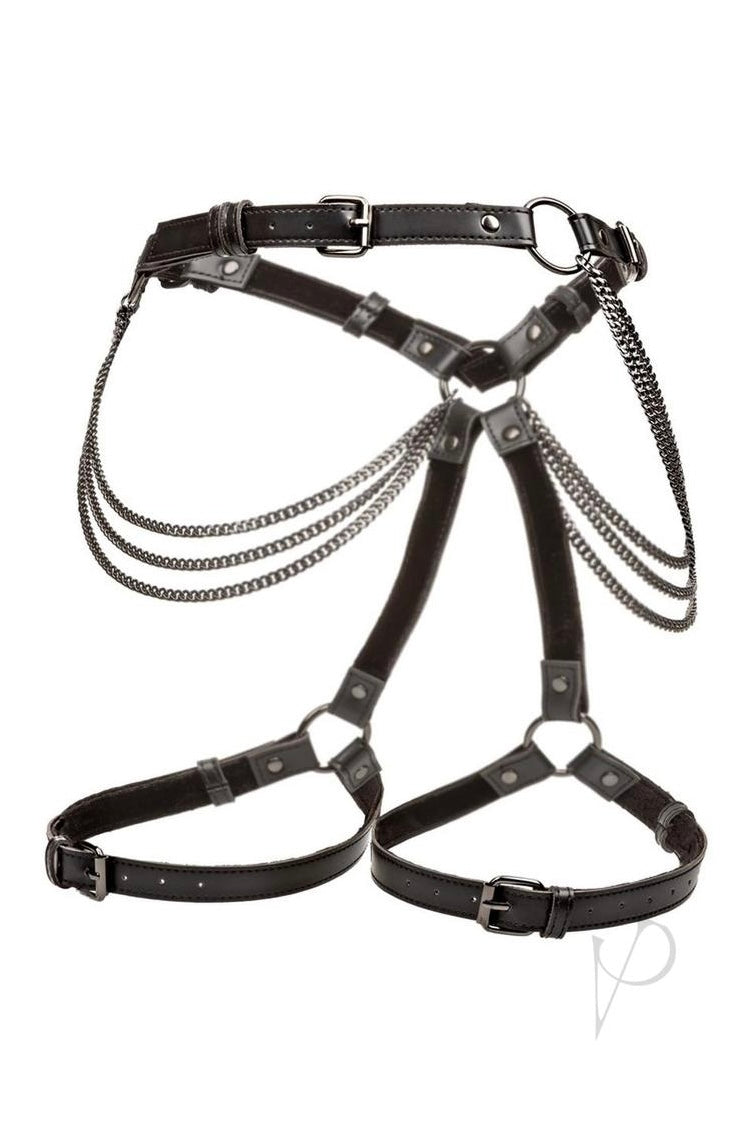 Enhanced with non-tarnishing metal accents, this thigh harness exudes elegance and adds visually stunning and enticing appeal.
