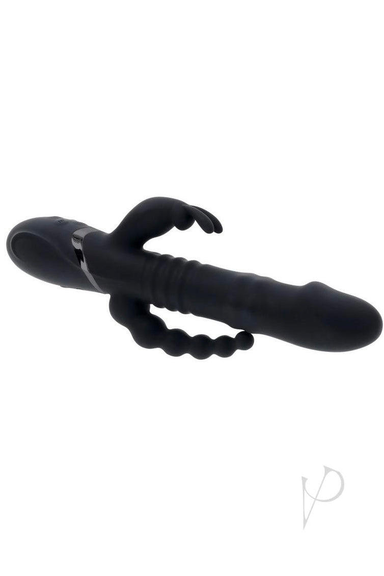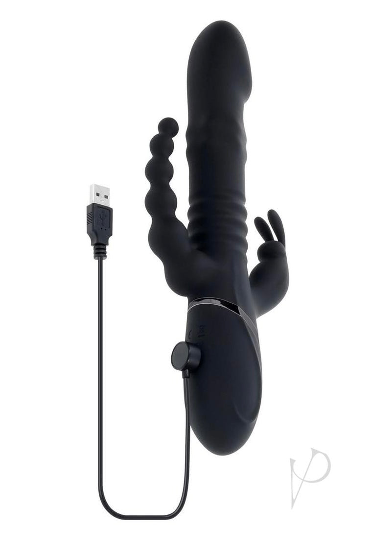 Turn it on and feel the Big Bunny Energy for yourself. Stimulating three erogenous zones at once, this energetic triple-shaft Rabbit Vibrator will leave you breathless. Two swirling beaded rings inside the main thrusting shaft provide a thrilling internal massage that begins at the realistically-shaped tip. Explore a tri-gasmic experience with the gently curved Anal Beads, powerful vibrations in the shaft, and external bunny shaped stimulator.