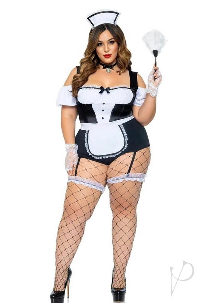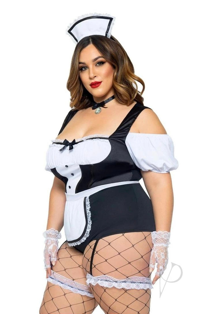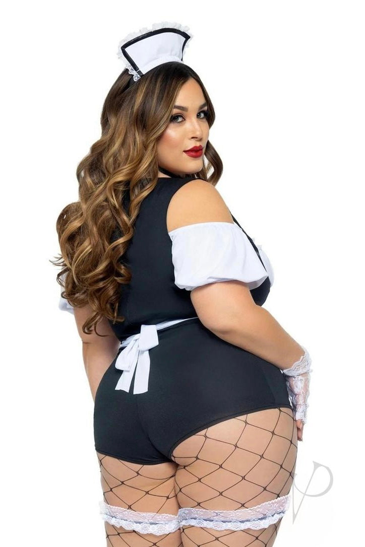 From the Halloween party to year-round play time, the smoking hot Curvynlingerie Plus Size plus size Merry Maid Costume is sure to have everyone saying “Oui Oui!” The ultra sexy maid costume features a cold shoulder garter bodysuit with attached apron, choker, and hot headband.