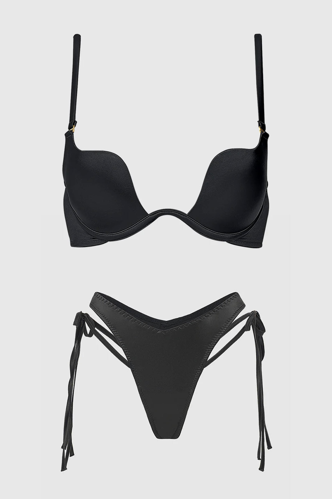 Unleash your fierce side with the Brigeta Satin Plunge Push-Up Bra & Tie Side Tanga Set. Boldly feminine, this ensemble combines luxurious satin with daring plunge and tanga tie-side details for undeniable allure.