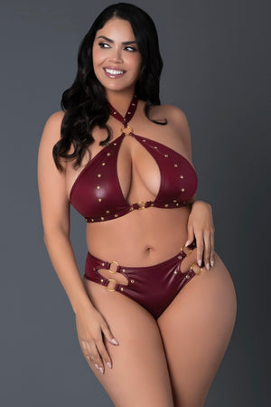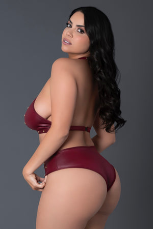 Plus size Faux leather halter bra and short burgundy