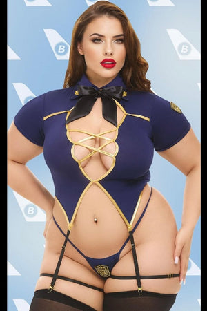 Prepare for takeoff — this outfit is guaranteed to turn heads. Take your fantasies to new heights with the First Class Fantasy lingerie set. This bold and seductive 4-piece costume includes everything you need to take command: a sultry navy bodysuit with gold trim and daring cutouts, a cheeky panty with an embroidered aviation-style patch, adjustable garter straps, and a sleek satin neck tie for a polished finish. Crisscross detailing in front adds an extra dose of allure, while the short sleeves and mock collar keep the look sharply styled. Whether you're dressing to impress or just having fun, this attention-grabbing set guarantees first-class service. Available in One Size Fits Most and Queen Size for a confident fit.