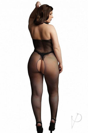 Bodystocking with a combination of lace-pattern and fishnet. This style has a halter neck and open crotch. This bodystocking has a lot of stretch and can be worn from size XL to 4XL.