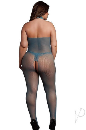 Bodystocking with a combination of lace-pattern and fishnet. This style has a halter neck and open crotch. This bodystocking has a lot of stretch and can be worn from size XL to 4XL.