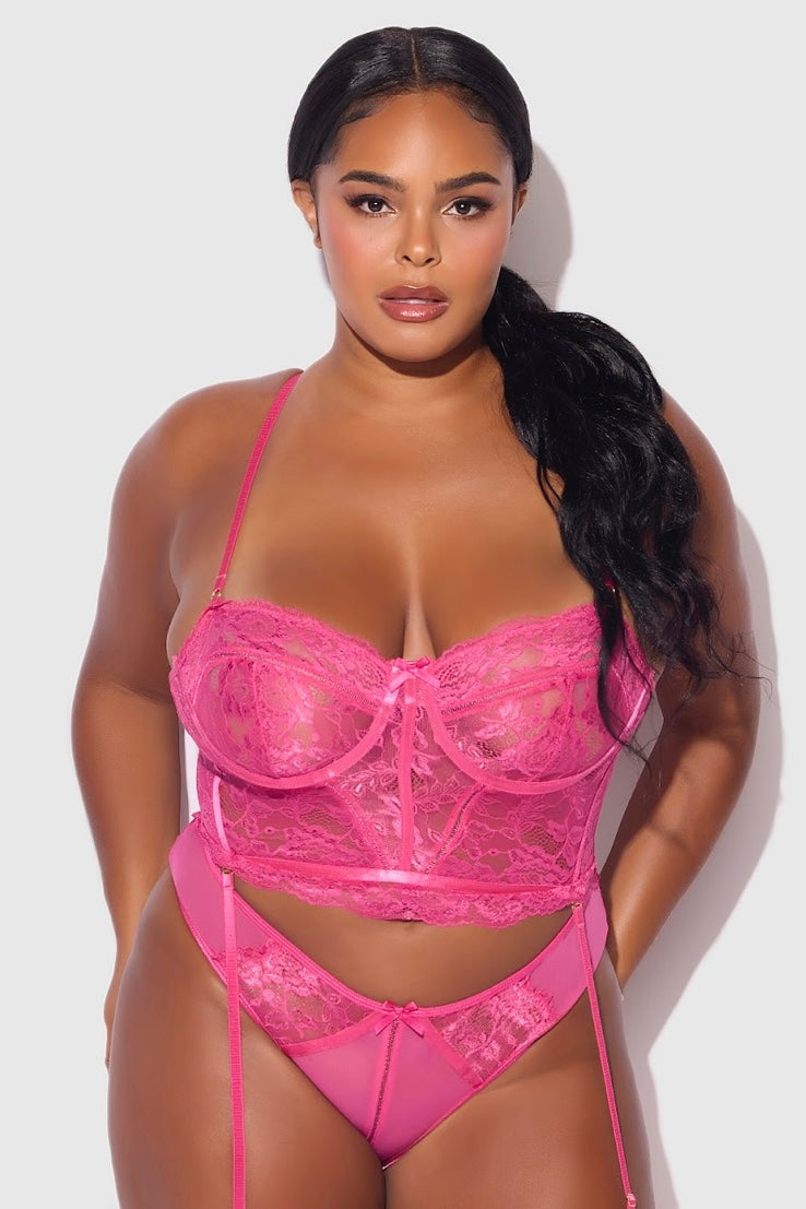 Enhance your date nights with the Plus size Harlow Bustier and Backless Hipster Set. This stunning ensemble features intricate lace, satin bindings, and adjustable closures for the perfect fit. The accompanying daring lace panty completes the shapely silhouette, making for a night you won't forget.