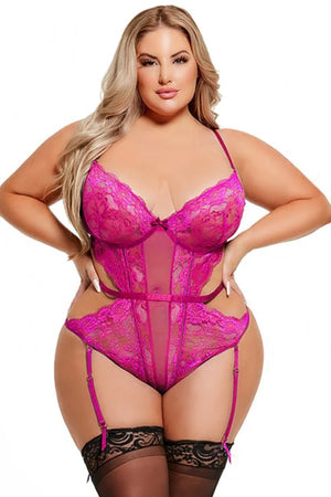 The Plus Size Harlow Lace & Mesh Underwire teddy in Fuschia will elevate your allure. With daring cutouts and exquisite lace, this teddy exudes elegance and bold sensuality. Step into confidence with this statement-making piece.