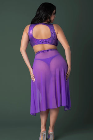 Light up the stage, club, or rave scene with the Glimmer High Neck Crop Top, Flowy Skirt & Tanga set. This three-piece dancewear set features a high neck crop top with front ties and a swan hook back closure, a high-leg tanga, and a sheer mesh flowy skirt that ties in the front. Made from soft, stretchy holographic fabric in a vibrant purple with pink hues, this dazzling ensemble is perfect for performers and nightlife enthusiasts.