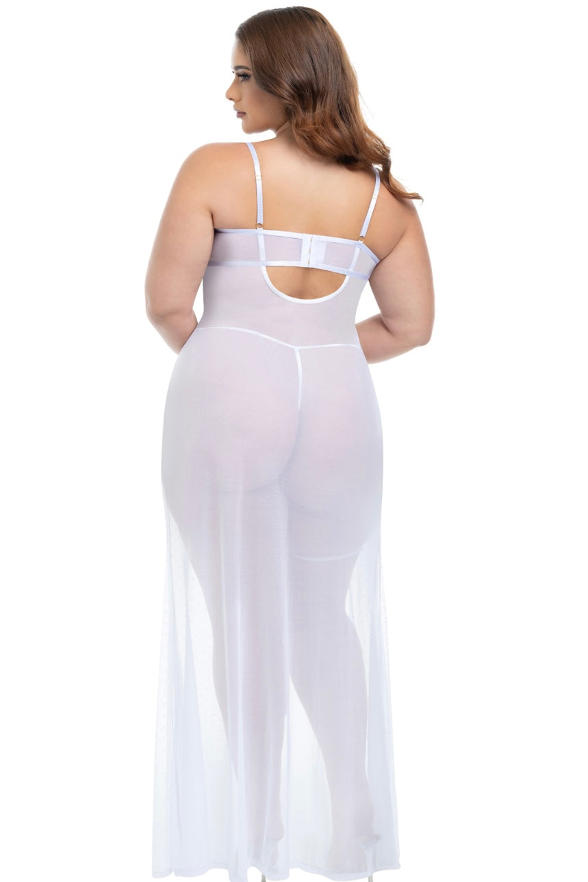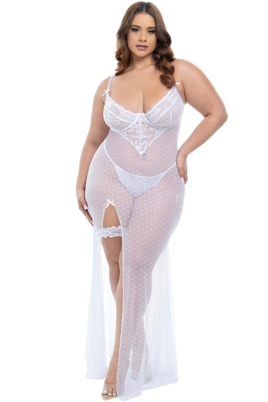This is a white, sheer, plus-size lace and mesh gown with a polka-dot pattern. The lingerie piece features a delicate lace bust with underwire support, adjustable spaghetti straps, and a semi-transparent bodice that accentuates the curves. A high slit on one side, adorned with a lace garter detail, adds a touch of elegance and sensuality. The gown is paired with a matching sheer thong for a coordinated look. Perfect for a romantic evening or special occasion, this piece blends femininity with sophistication.