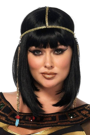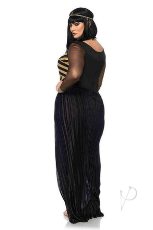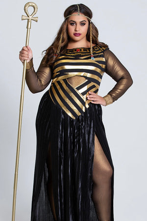 Celebrate your inner golden goddess in this absolutely stunning sexy plus size Cleopatra costume .The 3 PC Nile Queen plus size Halloween costume includes a gold shimmer catsuit, striped cut out dress with jewel collar, and a matching draped head piece. (Wig not included)