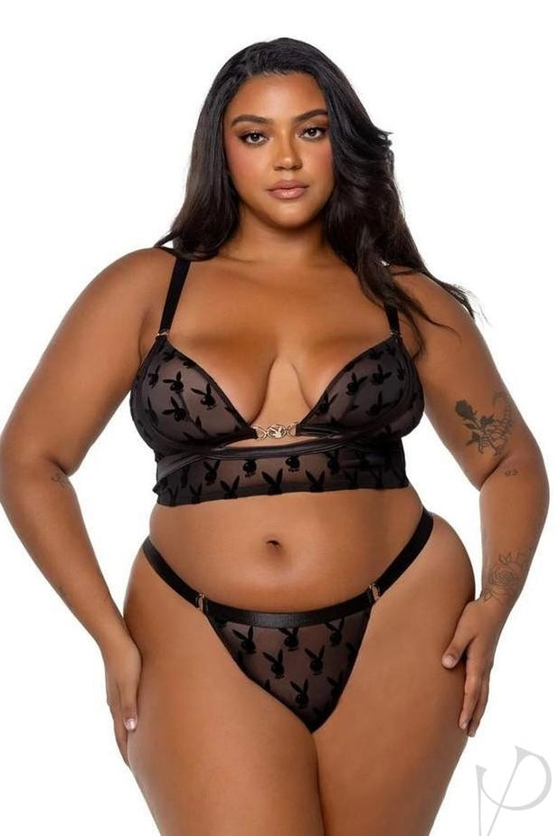 PLAYBOY BUNNY FLOCKED MESH BRALETTE WITH PLAYBOY BUNNY CHARM AND THONG PANTY
