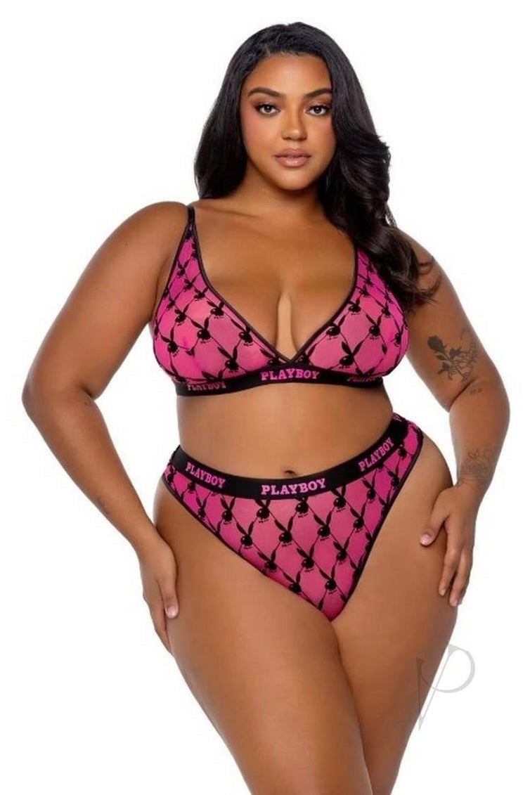 PLAYBOY BUNNY FLOCKED BUNNY ON SOFT BRA WITH THONG PANTY AND PLAYBOY ELASTICS