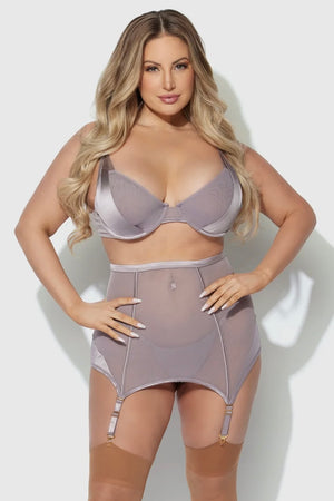 Be a temptation in mesh and silky micro with the Raquel Bra, Garter Skirt & G-String Set. Shimmy into a tantalizing trifecta of wired mesh bra, skirted garter belt, and matching G-string --- all detailed with silky micro for a dose of high shine.