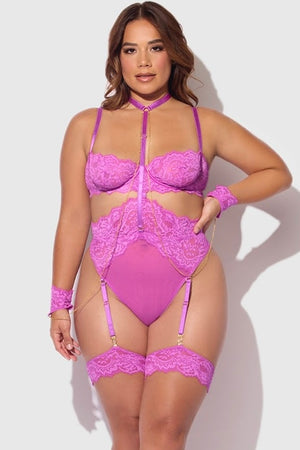 Expertly crafted from delicate lace and adorned with chain handcuffs, the Plus size Reanna teddy is the ideal combination of seduction and comfort. This alluring piece is designed to enhance your curves, providing both support and flexibility. Elevate your intimate moments with this must-have lingerie.