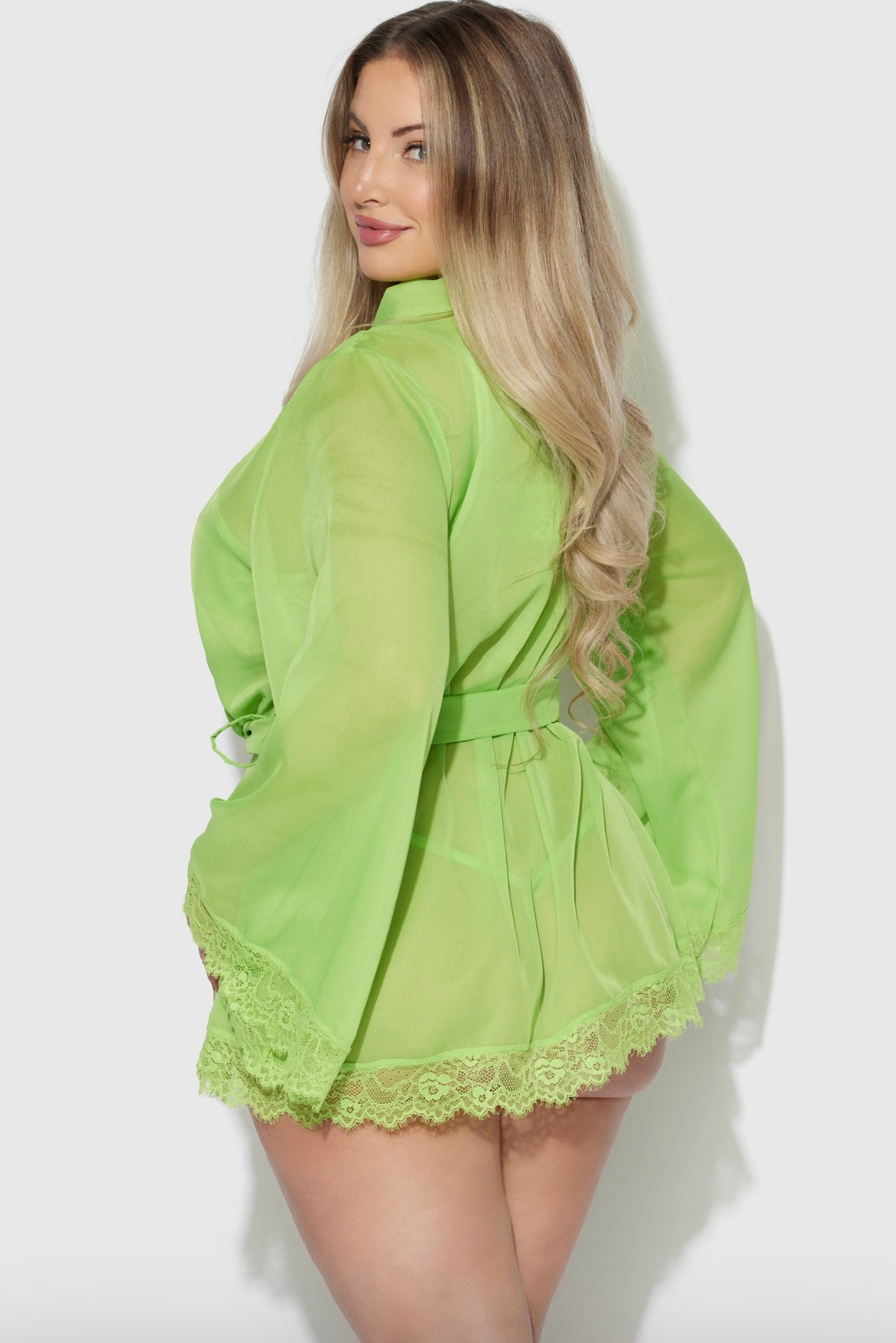 Indulge in luxury with our Plus size Shavon robe set in vibrant lime. This set includes a comfortable bralette and gstring, perfect for lounging or special occasions. The soft fabric and flattering fit are designed for the curvy body, providing comfort and confidence. Enjoy the perfect mix of style and comfort with our Plus size Shavon robe set.
