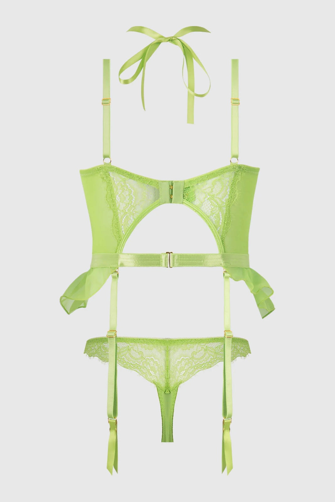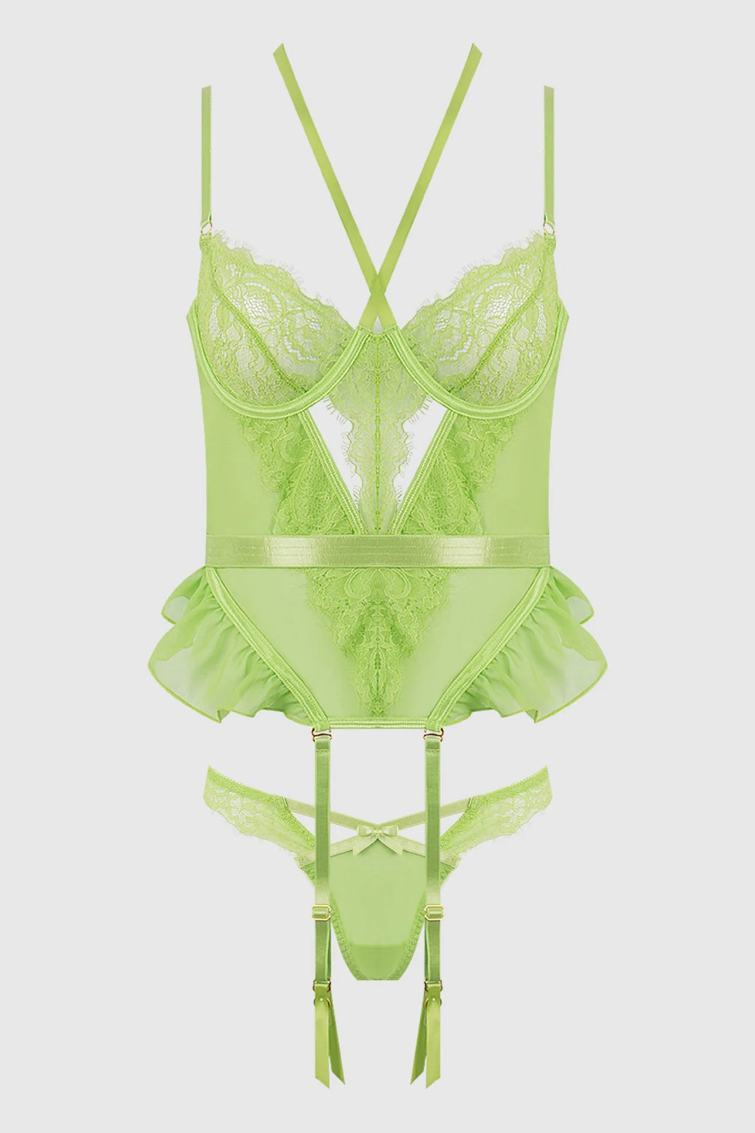 Let your heart flutter with excitement as you slide into the Shavon Bustier. Fine chiffon and delicate lace conspire to ignite your passion. Decorated with sexy cutouts and a playful satin halter-tie waiting to be unraveled. Wear this corset to spice up your streetwear, or let the bedroom mischief begin when you pair it with the matching lace thong.