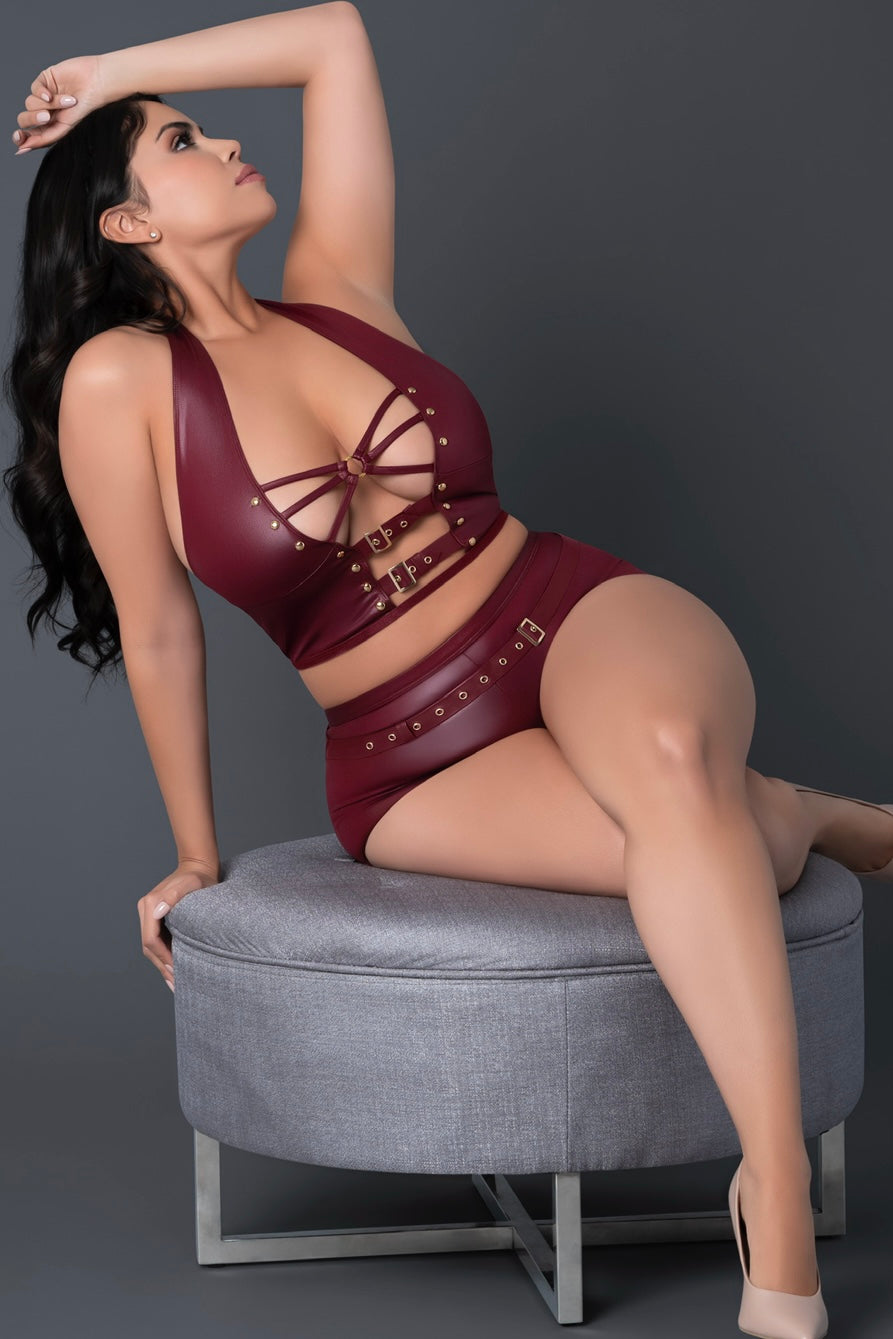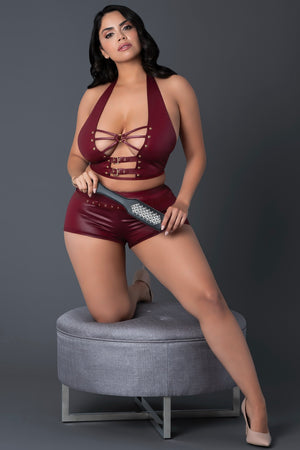 this style includes: a play top with bold cutouts, secured with straps and mini belt buckles, and hot shorts for full coverage and comfort. A halter-style neckline adds elegance, while a detachable buckled belt offers a customizable fit. Nickel-plated studs, rings, and buckles complete this stylish look.
