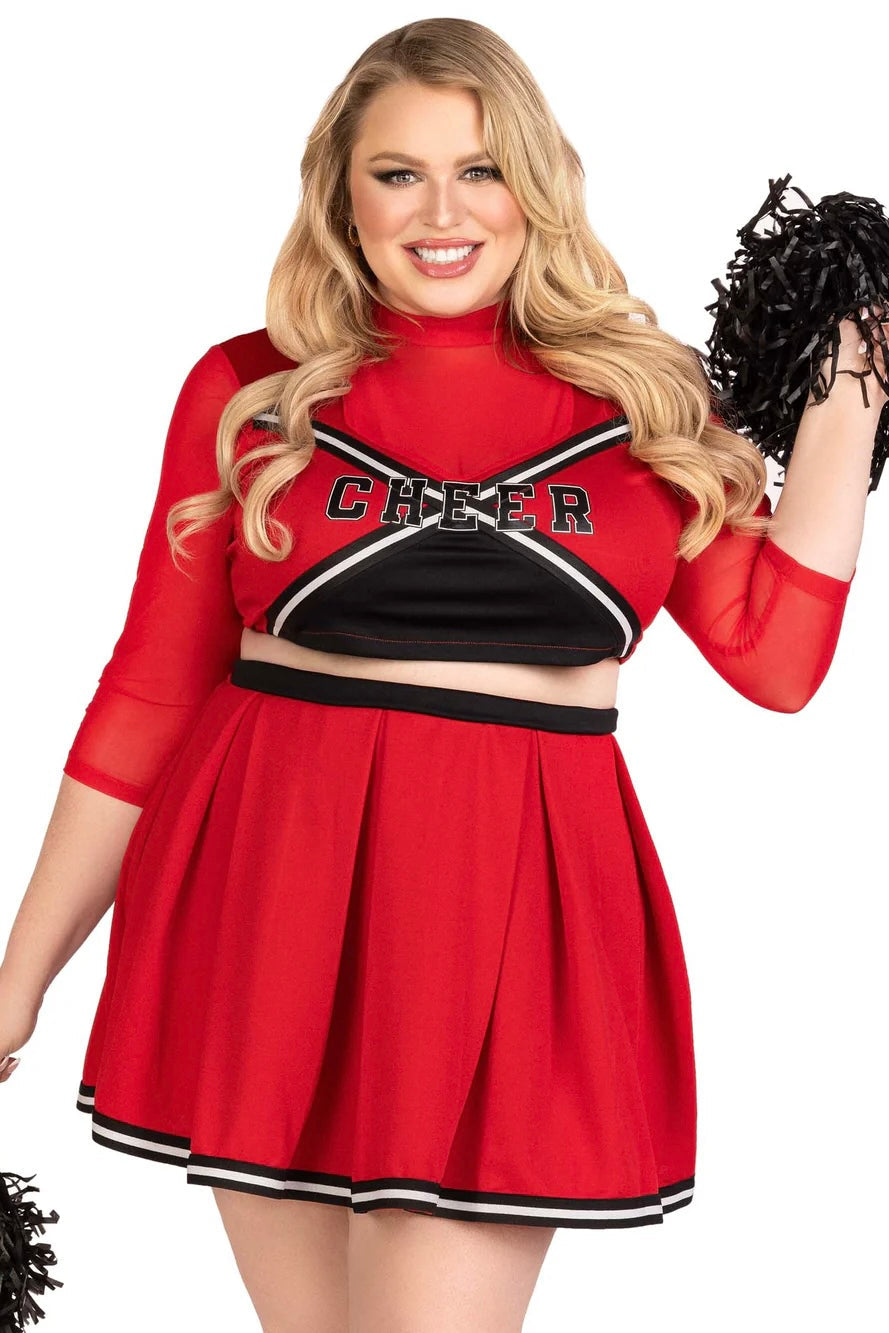 Get those spirit fingers ready, the 3 Piece Varsity Babe plus size Halloween costume is sexy and cute and popular to boot! This cheer-tastic womens Halloween costume includes a cute crop top with cheer logo and sheer panels, pleated cheer skirt, and pom poms. Amazing quality and perfect fit. Fun for a Bring it On inspired group Halloween costume!
