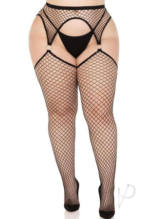 Industrial Net Stockings With O-Ring Attached Garter Belt. Black 1X-2X